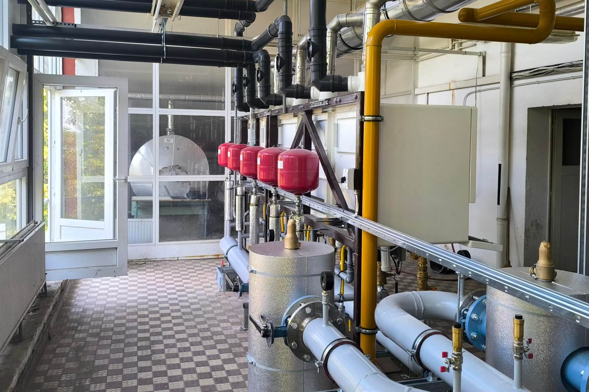 5 db Hoval TopGas® 120 kondenzációs fali gázkazán, egy Hoval TransTherm aqua L töltőmodul és egy 800 l-es puffertároló elégíti ki az iskola fűtési és HMV-igényét