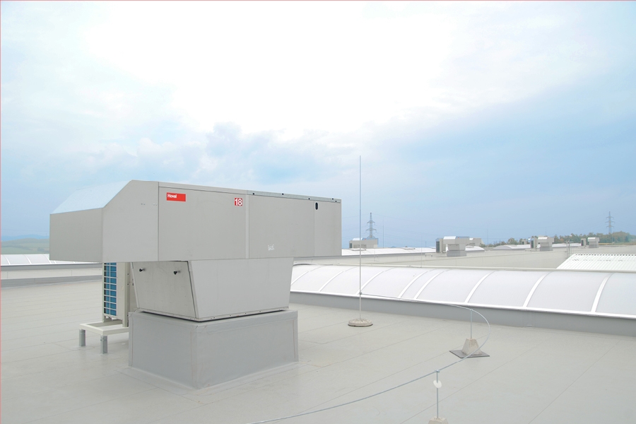 A csarnokklíma-készülékhez egy modulációs levegő/levegő hőszivattyús rendszert integráltunk, ami a környezeti levegő energiáját környezetbarát módon használja a csarnokok fűtésére és hűtésére. Ez a reverzibilis hőszivattyú a beépített hőcserélővel kombinálva a berendezést az energiatakarékosság mesterévé teszi.