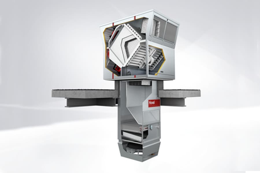 Szellőztető berendezés nagy teljesítményű hővisszanyerővel magas csarnokok fűtéséhez