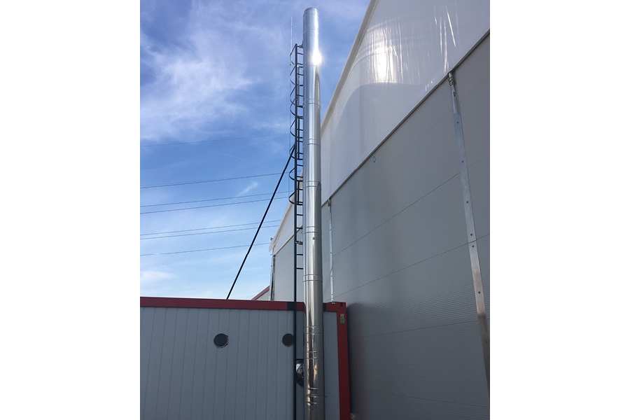 Eka Complex D 350/400 szigetelt, szerelt kémény oldotta meg a füstgáz-elvezetést a VB idejére ideiglenesen felépített mobil uszodánál