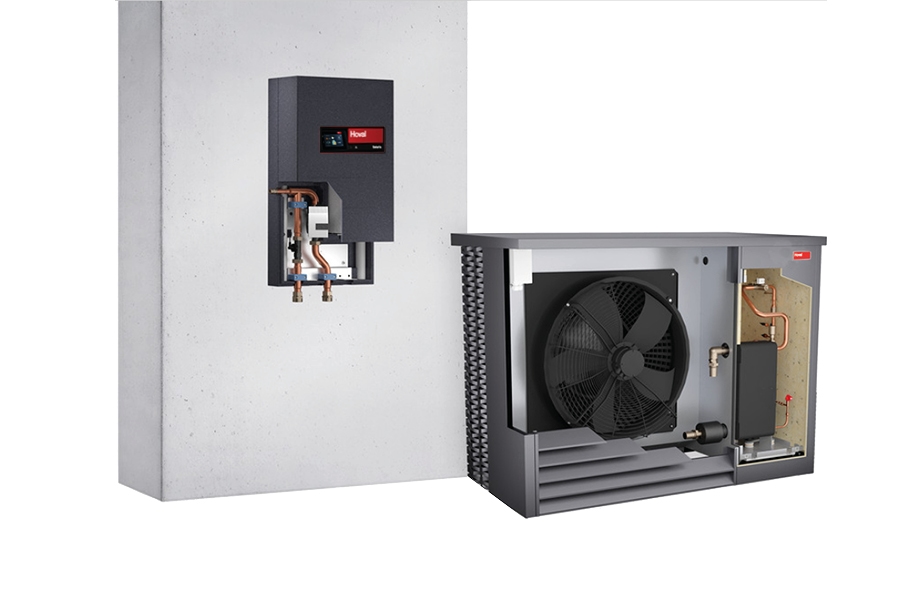 A házon kívül van elhelyezett kültéri egységből és házon belüli, falra szerelhető, helytakarékos, kezelőmodullal ellátott beltéri egységből áll, 70 °C-os előremenő hőmérsékletig.
