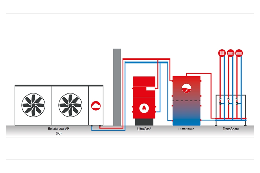 A Hoval Belaria® dual AR (60) kültéri felállítású, kompakt kivitelű, 2-fokozatú levegő/víz hőszivattyú fűtésre, hűtésre és HMV-készítésre