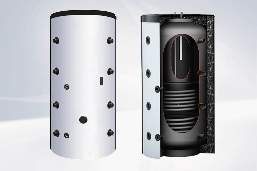 Az 500 - 900 liter űrtartalmú, feketére lakkozott fűtési puffertartály belsejében egy behegesztett 150 vagy 200 liter térfogatú, zománcozott használati melegvíztartály található.