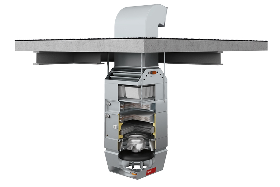 A mennyezet alá szerelt készülék egy külső légcsatornához csatlakozik. A csappantyúk helyzetétől függően beszívja a külső és/vagy helyiséglevegőt, felmelegíti vagy lehűti, majd az örvénykamrán (Air-Injectoron) keresztül visszafújja a helyiségbe.